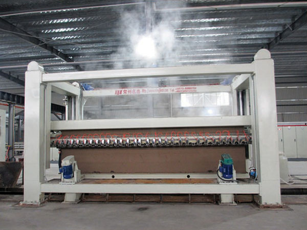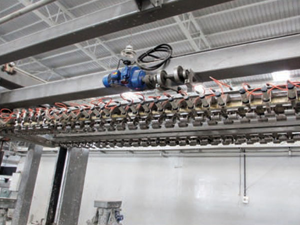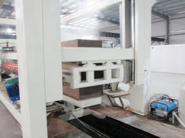 當澆注預養好的模坯在空中翻轉90°吊至切割小車(chē),脫去??蚝?,由一部切割小車(chē)載運至縱切機、橫切機工位對坯體進(jìn)行六面切割。首由縱切機對坯體進(jìn)行縱向、水平四面切割,完成后由切割車(chē)載運坯體停留在橫切機工位,完成后經(jīng)液壓升裝置上升抬起胚體,一部切割小車(chē)退回初始位置準備運載下一模胚體,以備切割。二部切割小車(chē)行至橫切機位置,液壓升裝置下降將坯體放至二部切割小車(chē)上,然后由橫切機對坯體進(jìn)行垂直切割,切割完成后仍由二部切割車(chē)運載坯體運行至半成品吊具下方,由半成品吊具將坯體吊到蒸養車(chē)上做預編組。切割周期約4. 5min.