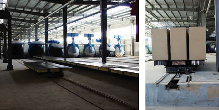 蒸養小車(chē)是生產(chǎn)過(guò)程中的專(zhuān)用運輸車(chē)輛,其裝載著(zhù)切割后的坯體,進(jìn)入蒸壓釜蒸養。蒸養后,將成品運送至成品場(chǎng)地。成品雕吊卸后,蒸養車(chē)再次載坯體入釜蒸養。